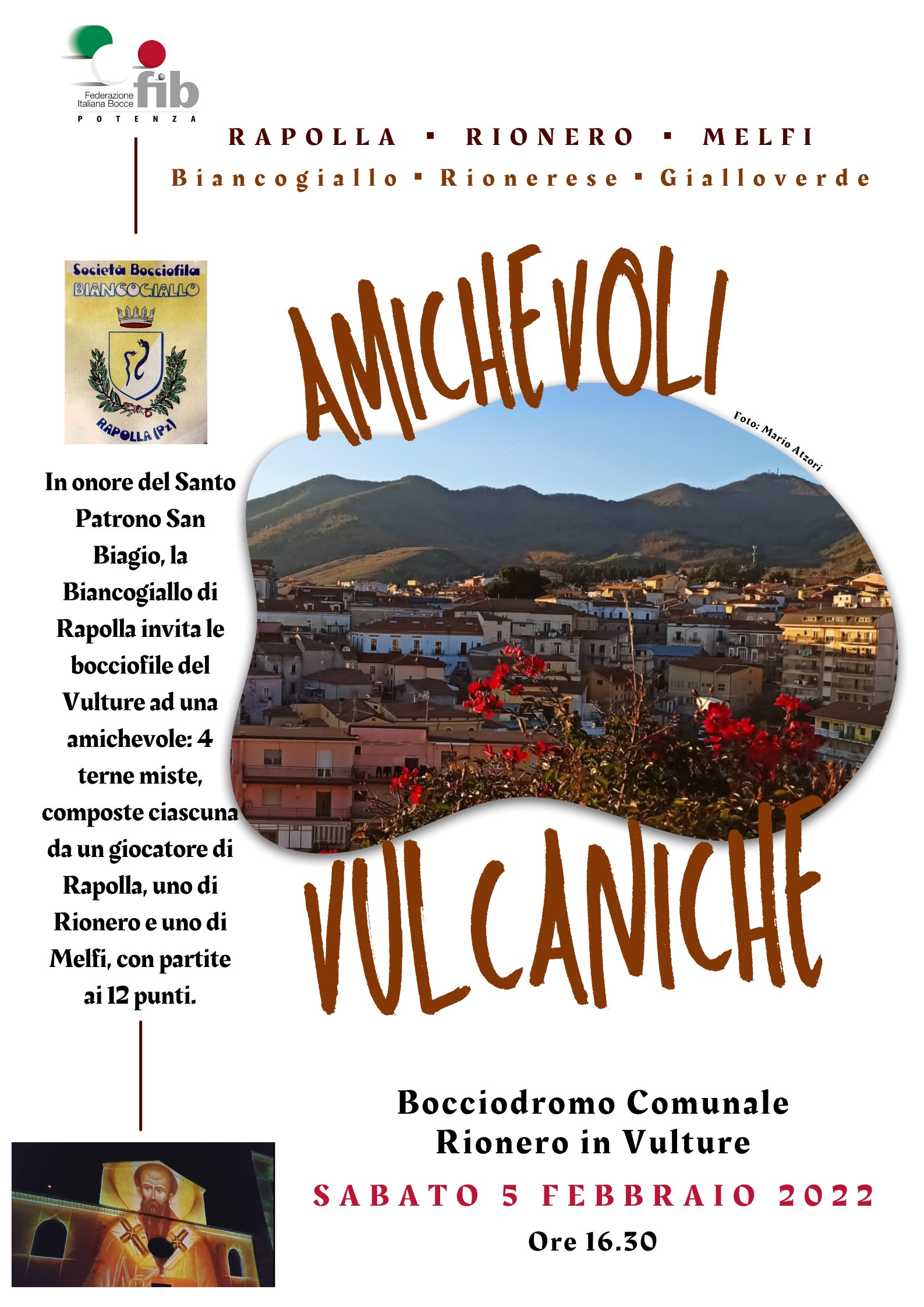 Si parte sabato 5 febbraio alle 16.30 a Rionero in Vulture con un incontro organizzato dalla Biancogiallo di Rapolla, Amichevoli Vulcaniche, in occasione della festività di San Biagio, protettore dei rapollesi. Storicamente, infatti, questa festività del Santo del 3 febbraio ha sempre visto protagonista il piccolo club di Rapolla ed ora, riprendendo questa tradizione, propone alle altre bocciofile del Vulture-Melfese, Rionerese e Gialloverde, una sfida a terna, dove ogni terna sarà composta da un giocatore delle tre società. L'iniziativa ha scopo promozionale e vedrà protagonisti anche dei neo-tesserati.