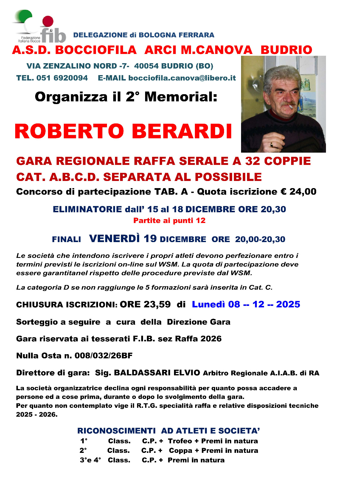 15/12/2025 - 19/12/2025 - Bocciofila Canova Budrio - 11° Memorial Roberto Berardi