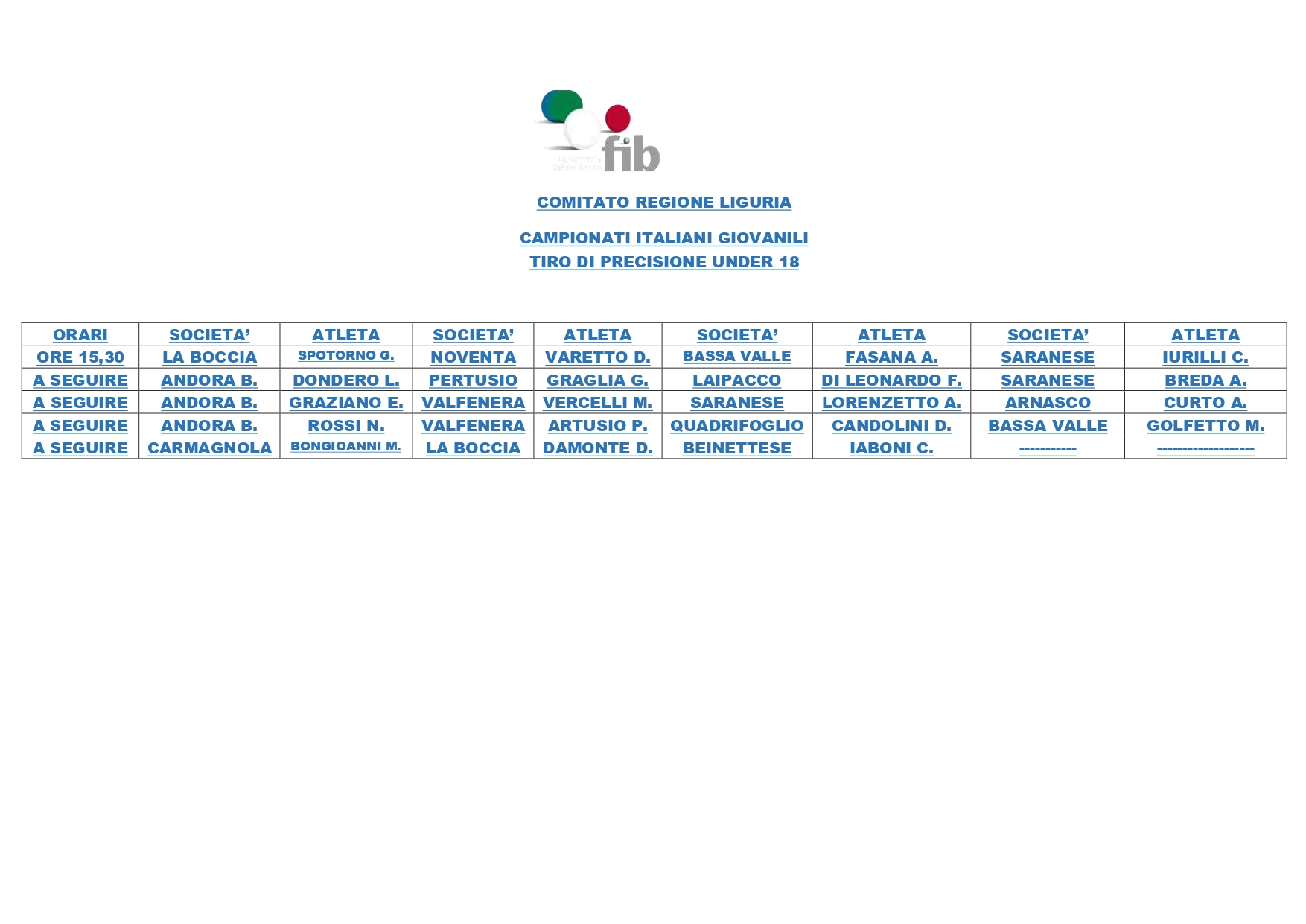VOLO : CAMPIONATI ITALIANI TIRI UNDER 15/18 ORARI