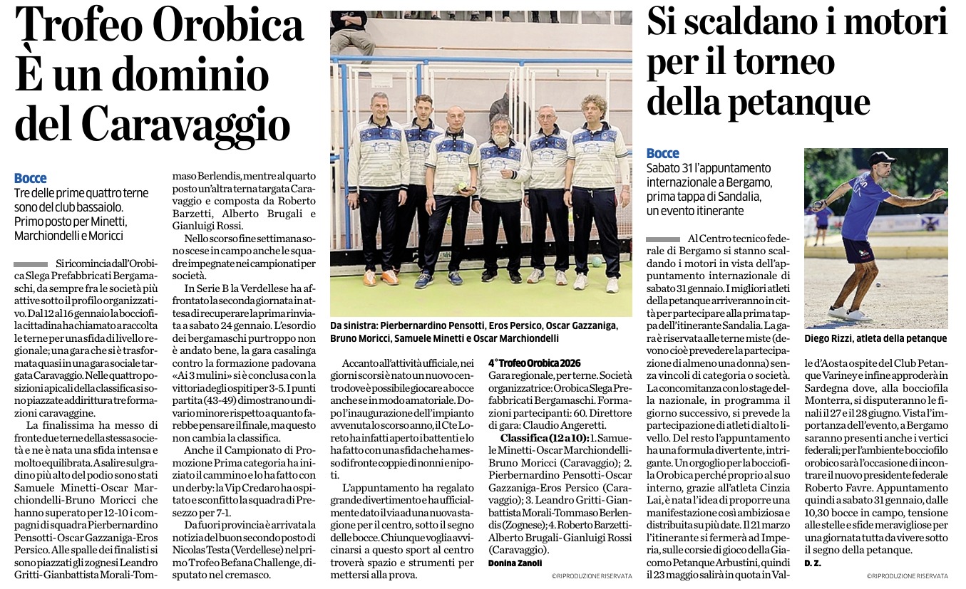 23 Gennaio Sull'Eco di Bergamo il "Trofeo Orobica" e i preparativi per l'evento internazionale della Petanque CONDIVIDI SUI TUOI SOCIAL