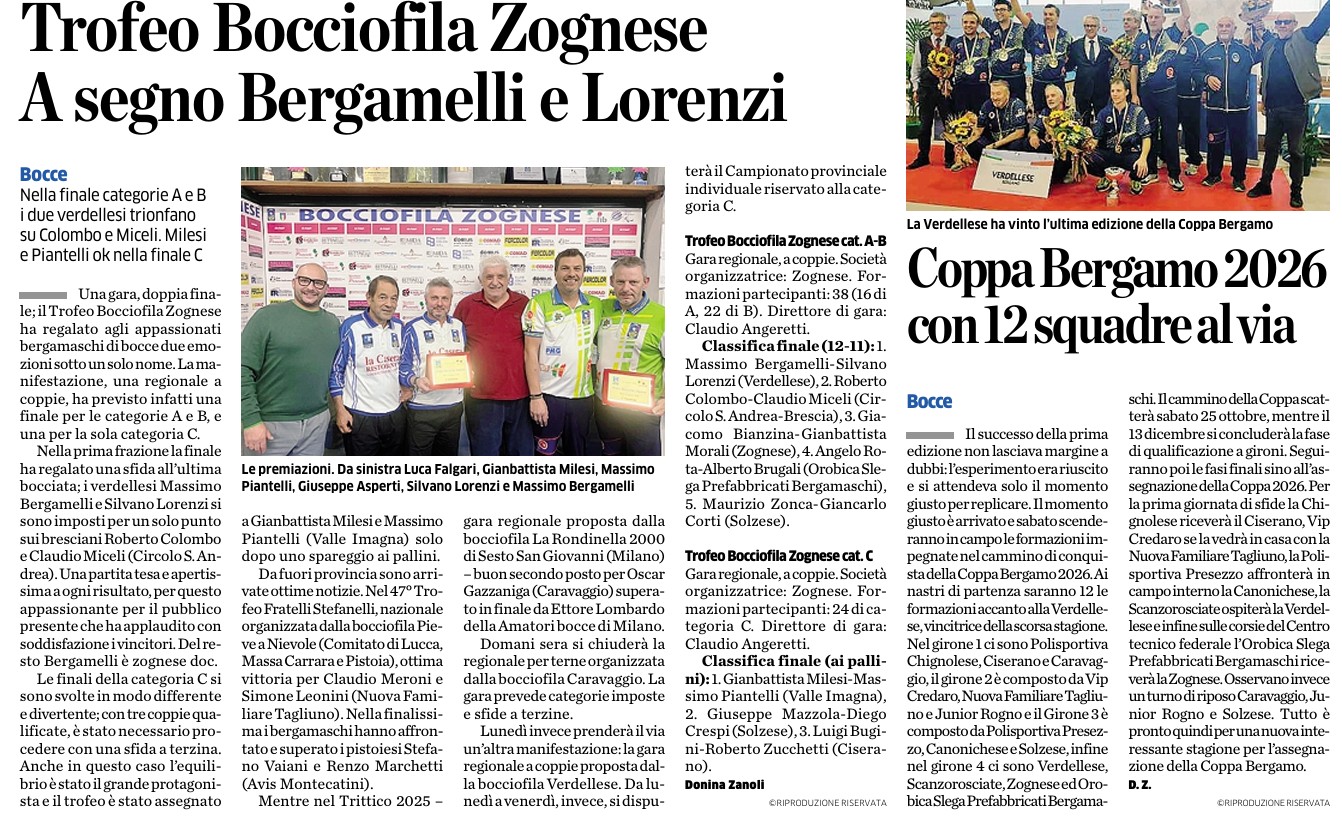 23 Ottobre Sull'Eco di Bergamo si parla del Trofeo Bocciofila Zognese e della Coppa Bergamo 2026 CONDIVIDI SUI TUOI SOCIAL