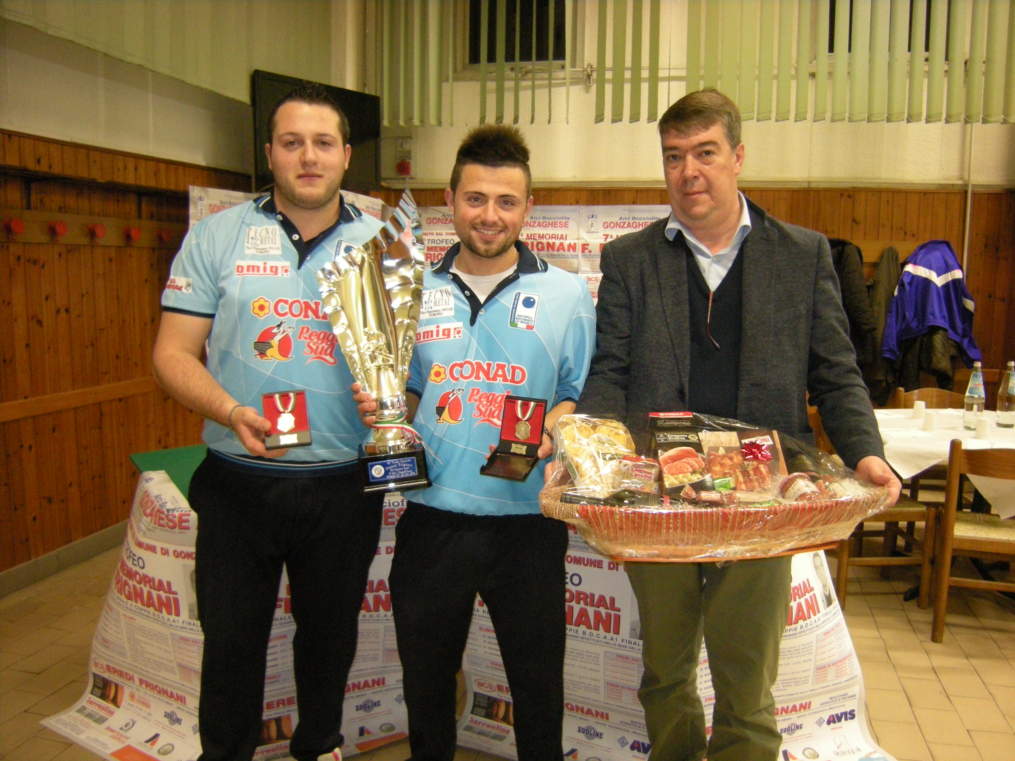 Come nella precedente edizione, la Bocciofila Suzzarese non ce l’ha fatta ha conquistare l’oro nel Trofeo Franco Frignani. L’anno la coppia di cat. B della Suzzarese Fausto Melli con Claudio Tosi si sono dovuti arrendere contro la coppia di cat. A Giampaolo Signorini – Maurizio Bortesi dell’M.P. Filtri MO. In questa edizione l’ argento se lo sono aggiudicati Stefano Riccò – Giulio Lanfredi di categoria B contro la giovane copia del Buco Magico RE di categoria A, Francesco Parlato – Alessandro Clementi. Gara serale regionale a coppie, organizzata dalla Bocciofila Gonzaghese con le fasi eliminatorie nelle serate da lunedì 25 novembre a giovedì 28, sulle corsie di gioco della Suzzarese, Pegognaghese e in quelle di Gonzaga. Centoventotto le formazioni, che divise nelle varie categorie fino alla fine, si sono confrontate per aggiudicarsi la partecipazione alle fasi di finale. Finali andate in onda venerdì 29 con 5 coppie di categoria A, 5 B, 5 C e 1 D. Sotto lo sguardo di un numeroso e appassionato pubblico che ha seguito tutta la manifestazione fino alla fine, si sono concluse alle ore 23,45. Al primo posto, Francesco Parlato – Alessandro Clementi cat. A Buco Magico RE, secondi, Stefano Riccò – Giulio Lanfredi cat. B Suzzarese MN, terzi, Natalino Bolelli – Mauro Scaini cat. B Suzzarese MN, quarti, Gaetano Giaretta – Angelo Venturelli cat. C Valeggiana VR, al quinto posto, Giuseppe Bottura – Mauro Zambroni cat. A Peschiera Salumi VR, sesti, Giuseppe Benazzi – Paolo Vicari cat. C Pegognaghese MN, settimi, Antonio Sessa – Vanni Tirelli cat. B Rubbierese RE, ottavi, Leonardo Cavazzoni – Enrico Losi cat. D Dorando Pietri MO. La gara e stata diretta dal sig. Romeo Bertolani coadiuvato dagli arbitri del comitato Roberto Mambrini e Gianni Bertolani. Le premiazioni con medaglie d’oro, trofei e prodotti gastronomici alle prime quattro coppie classificate: Sono state fatte da Andrea e Alberto Frignani, figli di Franco a cui è stata dedicata la gara, coadiuvati da Alessandro Benatti, Franco Caramaschi e il presidente della bocciofila Ivo Salardi.