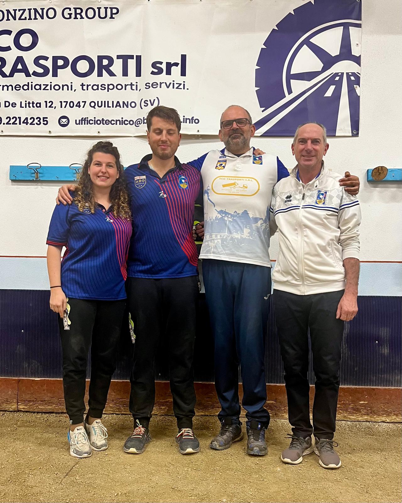 Sono Martina Simonotto e Saverio Amormino i vincitori del “Memorial Ninni” di Sassello, la gara nazionale a coppie per categorie AC-BB e inferiori. Tra le 30 formazioni ai nastri di partenza, a completare il percorso è stata quella dell’A.B. Genovese che in finale si è imposta 13-11 sulla squadra di casa, il Martina Sassello di Diego Marchelli e Bruno Pesce. In semifinale sé invece interrotto il cammino di altre due formazioni dell’A.B. Genovese. La coppia Jacopo Gardella e Giovanni Ferrera si è arresa sul 13-10 nel derby contro i vincitori del torneo mentre Ousseynou Thiam El Hadji e Pietro Pastorino sono stati battuti13-9 dai rivali del Martina Sassello. La direzione del torneo organizzato dal Martina Sassello, è stata affidata all’arbitro Giuseppe Baschiera di Rossiglione.