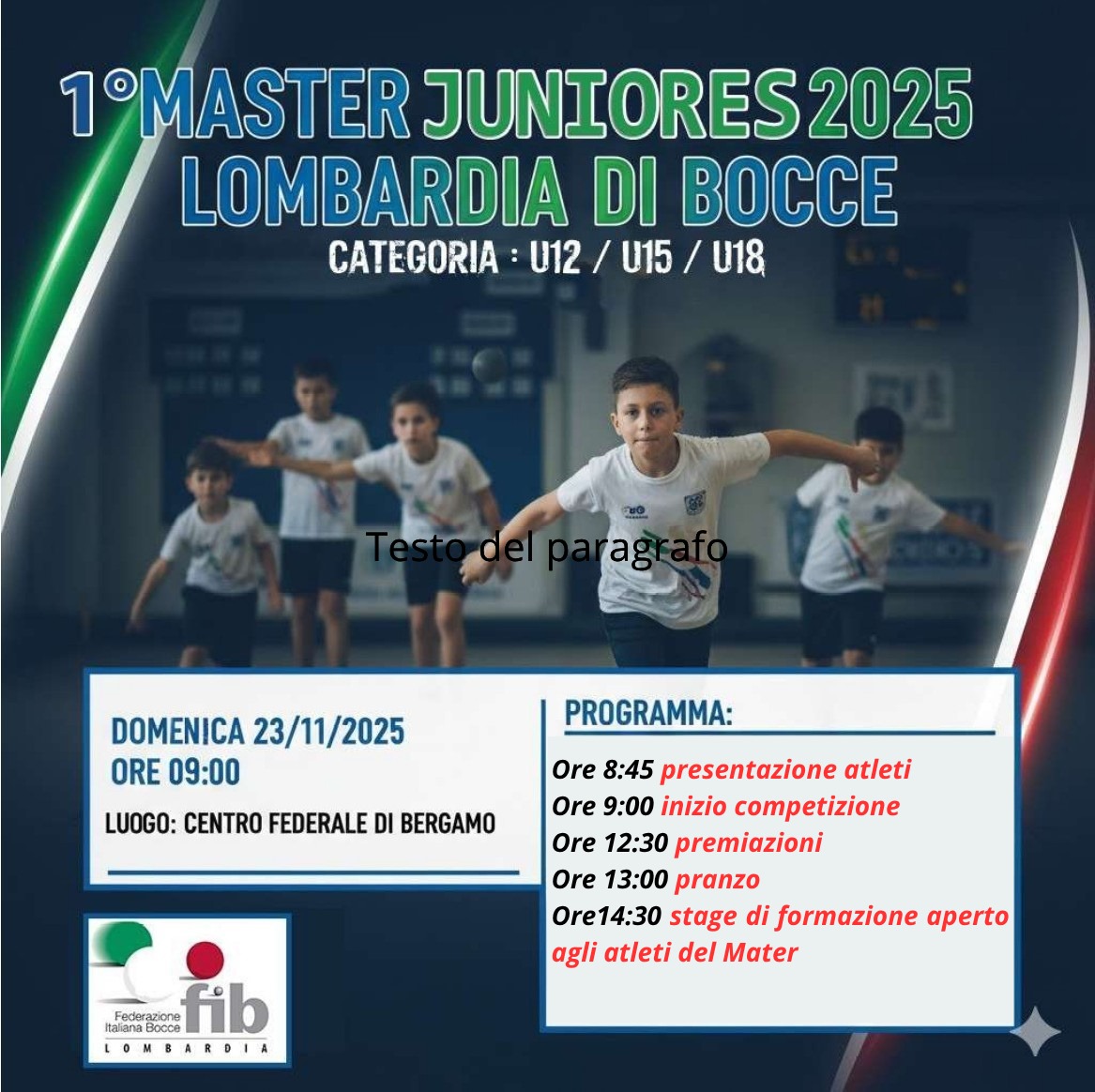 Si svolgerà domenica 23 novembre 2025, presso il Centro Tecnico Federale di Bergamo, il 1° Master Juniores Lombardo riservato alle bocce sintetiche: una sorta di vetrina, insomma, sul futuro del boccismo della nostra regione.