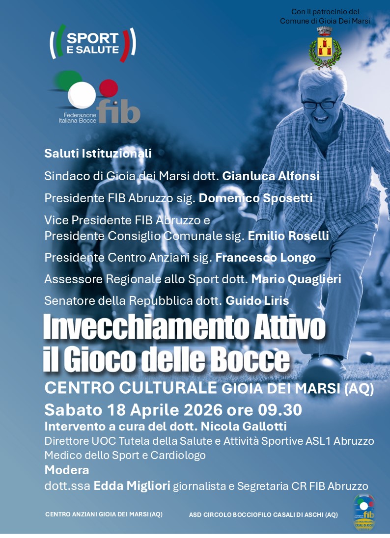 Avrà luogo a Gioia dei Marsi sabato 18 aprile, a partire dalle ore 9.30, presso il Centro Culturale, la tappa della salute del progetto “Invecchiamento attivo: il gioco delle bocce” promosso dalla Federazione Italiana Bocce e sostenuto da Sport e Salute S.p.A. nell’ambito dei programmi nazionali dedicati all’invecchiamento attivo.