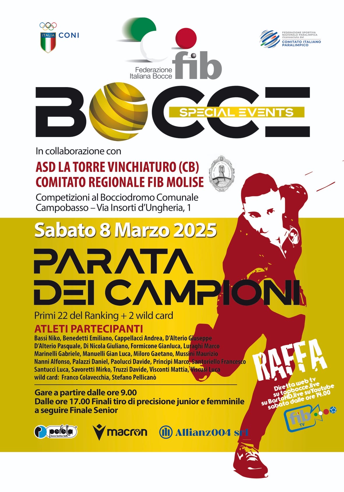 Sabato 8, dalle 9 alle 20, al Bocciodromo Comunale di Campobasso, si terrà la Parata dei Campioni, che vedrà al via i primi 22 atleti senior del Ranking nazionale, oltre a 2 wild card molisane; 8 atleti e atlete juniores selezionate dal ct azzurro Rodolfo Rosi; 8 atlete selezionate dal ct della nazionale femminile, Elisa Luccarini.